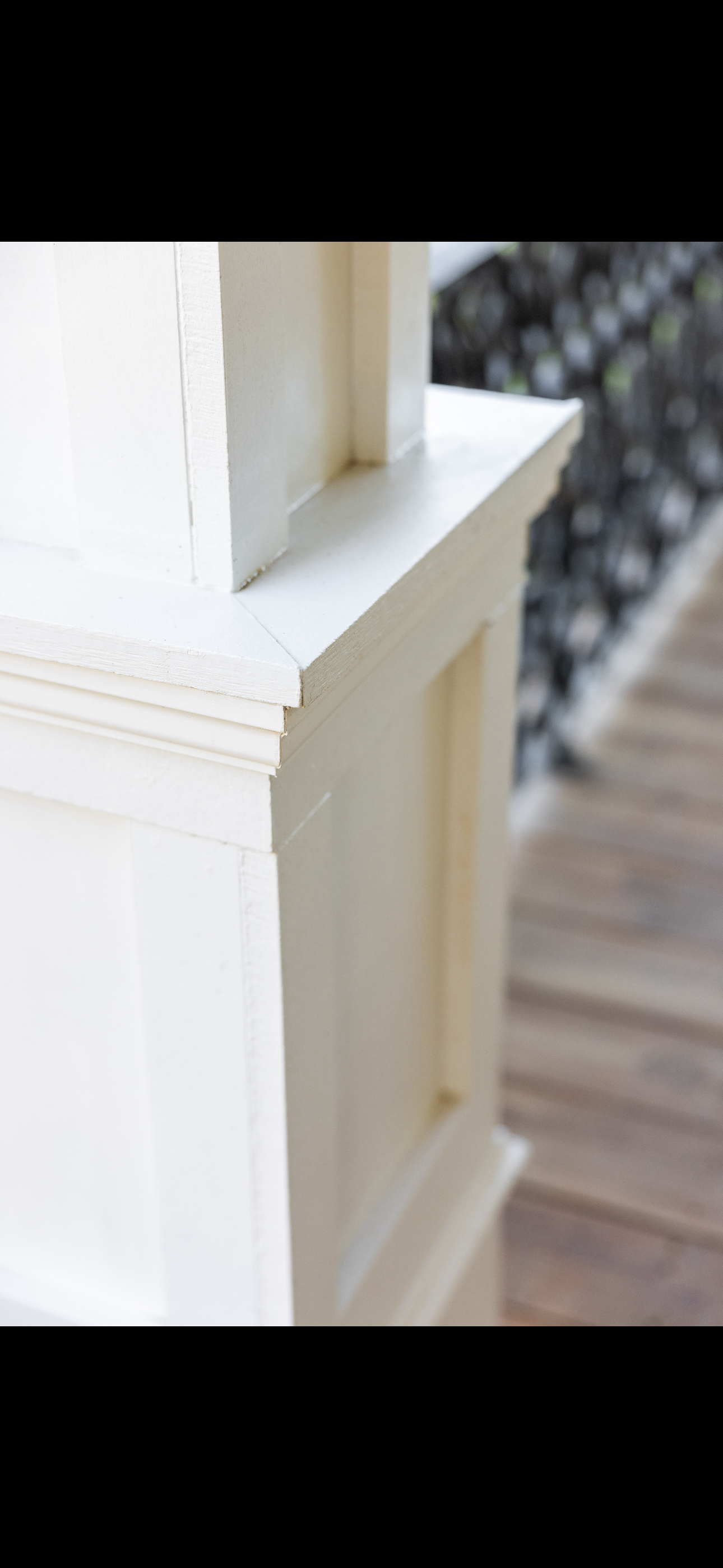 Close-up of a white decorative wooden railing or column with detailed molding, set against a blurred background.