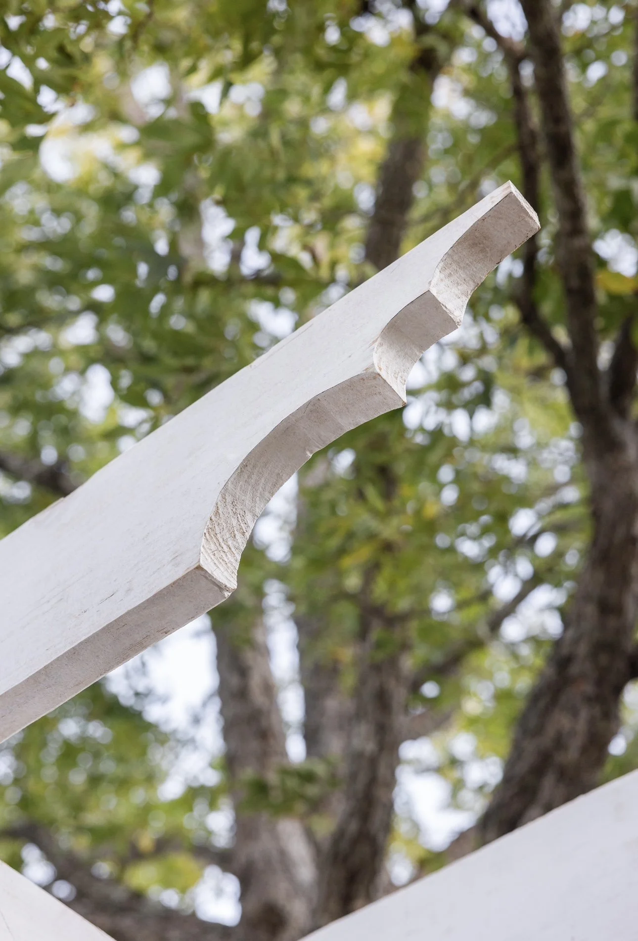 Close-up of a decorative white wooden beam with intricate carving, set against a background of lush green tree leaves.