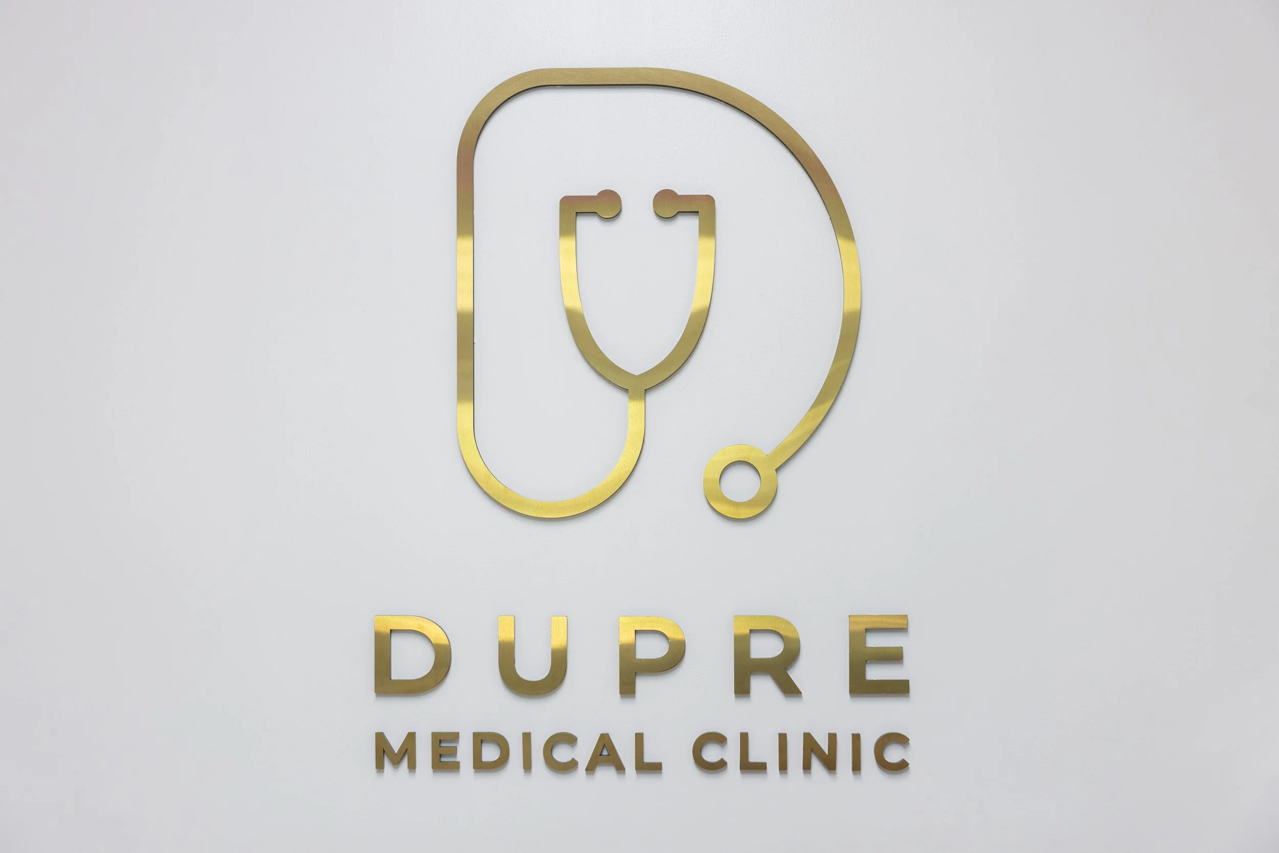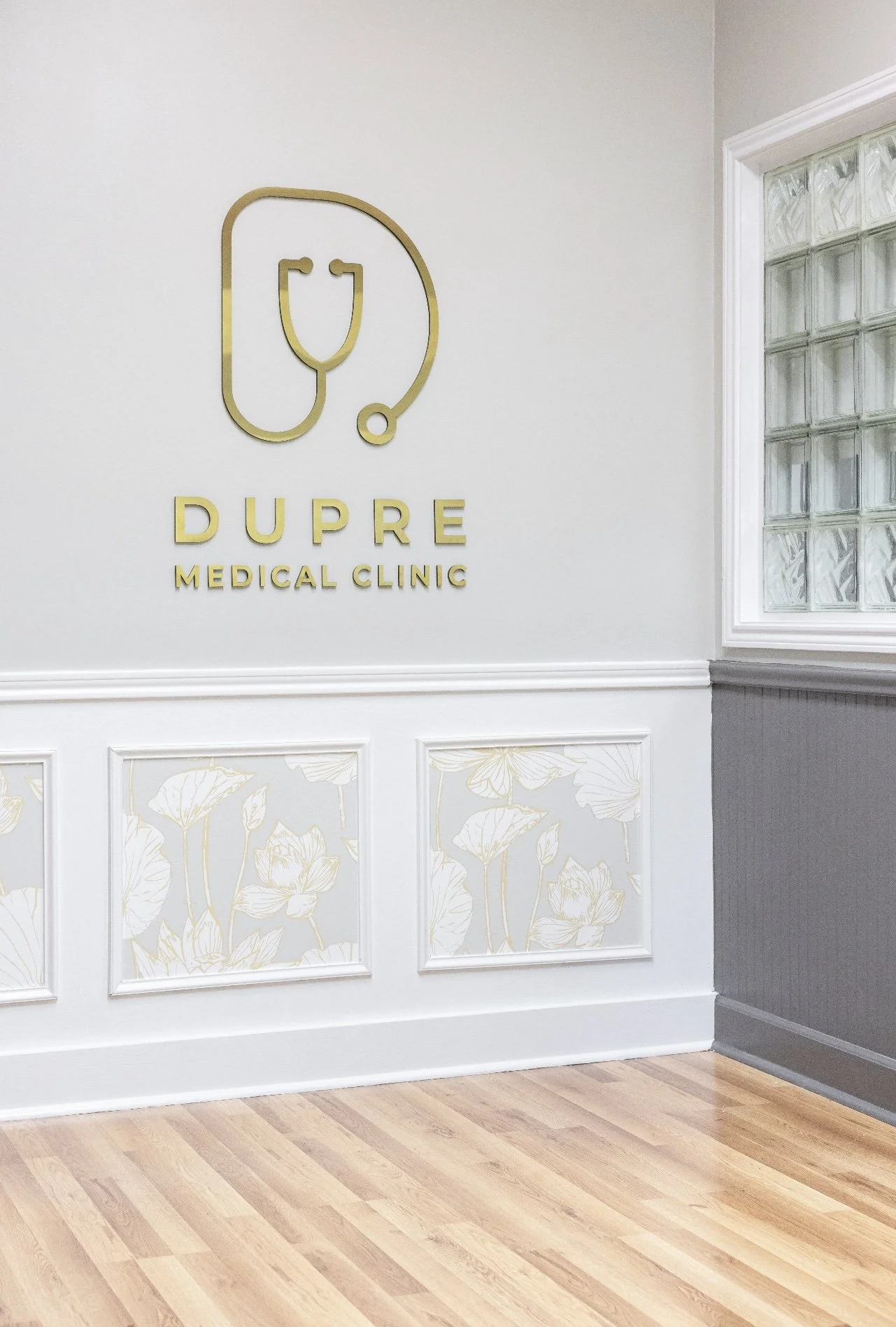 Dupre Medical Clinic logo on wall with stethoscope design, decorative wall panels, and wooden floor.