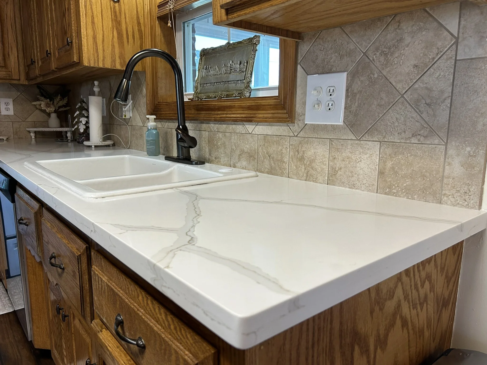 The freshly painted white walls created a crisp and clean environment. The new white quartz countertops offer a virtually seamless appearance, providing a smooth look for the area you probably spend the most time in. As for maintenance, they're easy to keep clean as they're water—and stain-resistant.