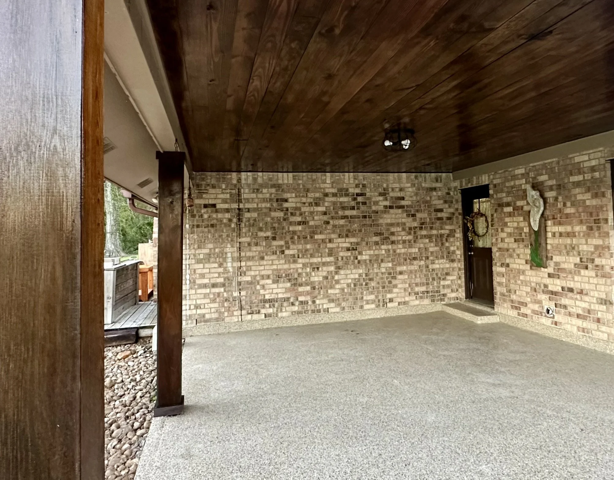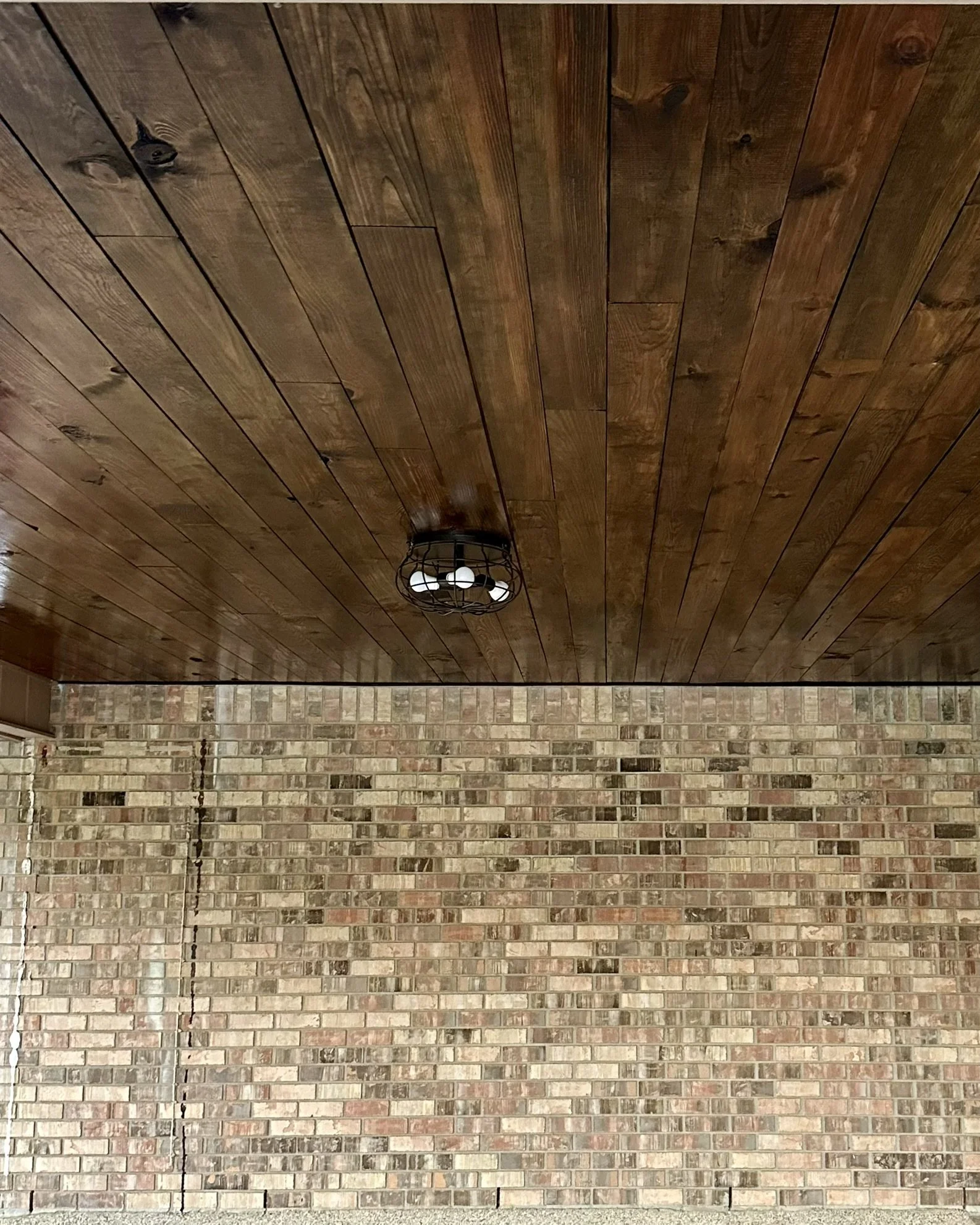 An upgraded porch ceiling with stained 1x6 tongue-and-groove, a traditional choice that can add a charming, cottage-style look to your space. A tongue and groove ceiling can be left natural, stained, or painted.